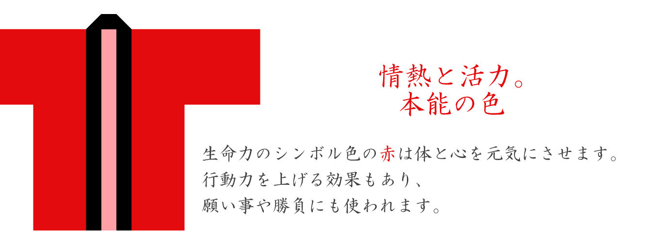 <赤のイメージ>情熱・活発・活力・興奮・パワフル・強いエネルギー・あたたかい・力強さ・派手・神聖な色(神社の鳥居など)・生命力のシンボル・活動的・必勝(勝負の色)