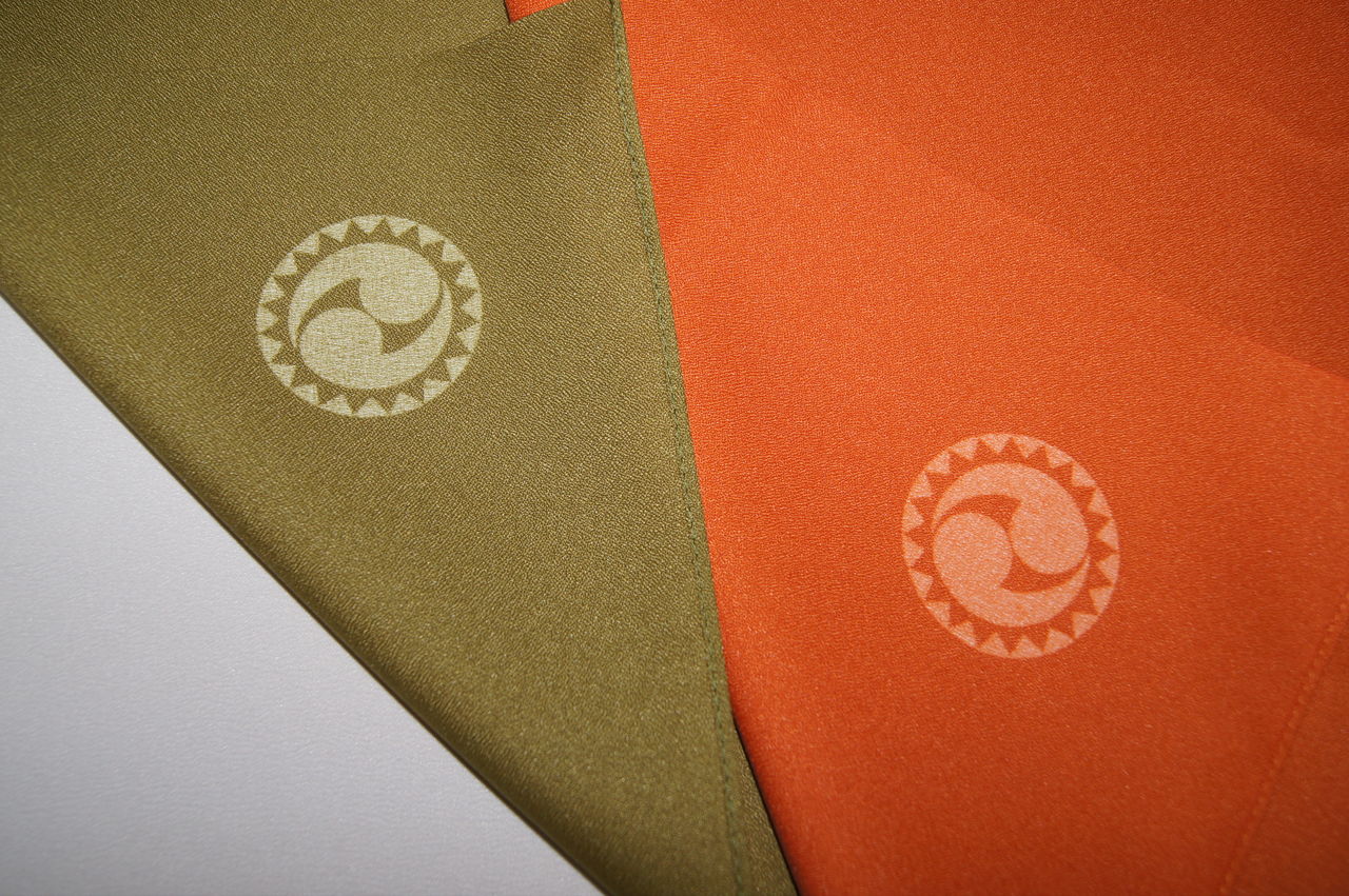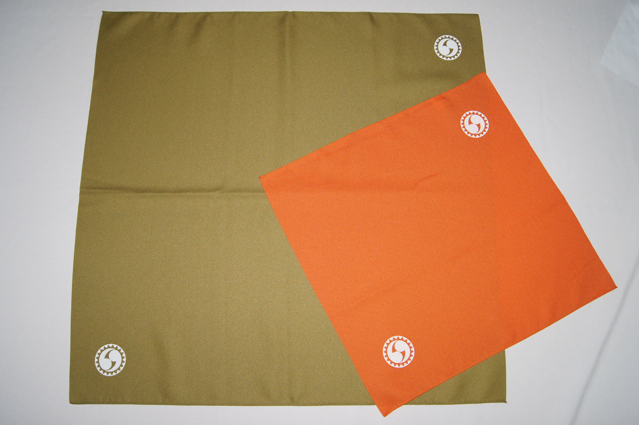 小風呂敷(約45cm角)のオレンジと二巾(約70cm角)の抹茶色。
